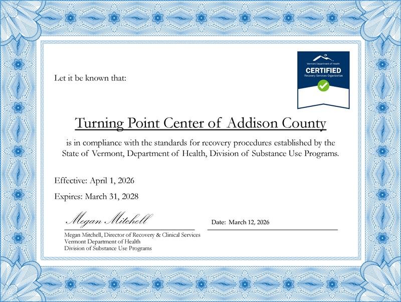 We’re proud to share that, effective April 1, 2026, the Turning Point Center of Addison County is officially recognized as a Certified Recovery Service Organization by the Vermont Department of Health. This certification reflects the strength, dedication, and heart of everyone who walks through our doors—participants, volunteers, staff, and community partners.
